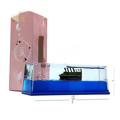 کشتی شناور، بصورت یک مکعب مستطیلی است که با مایع شفاف و آبی رنگ پر شده است و یک کشتی زیبای پلاستیکی داخل این مایع شناور است.